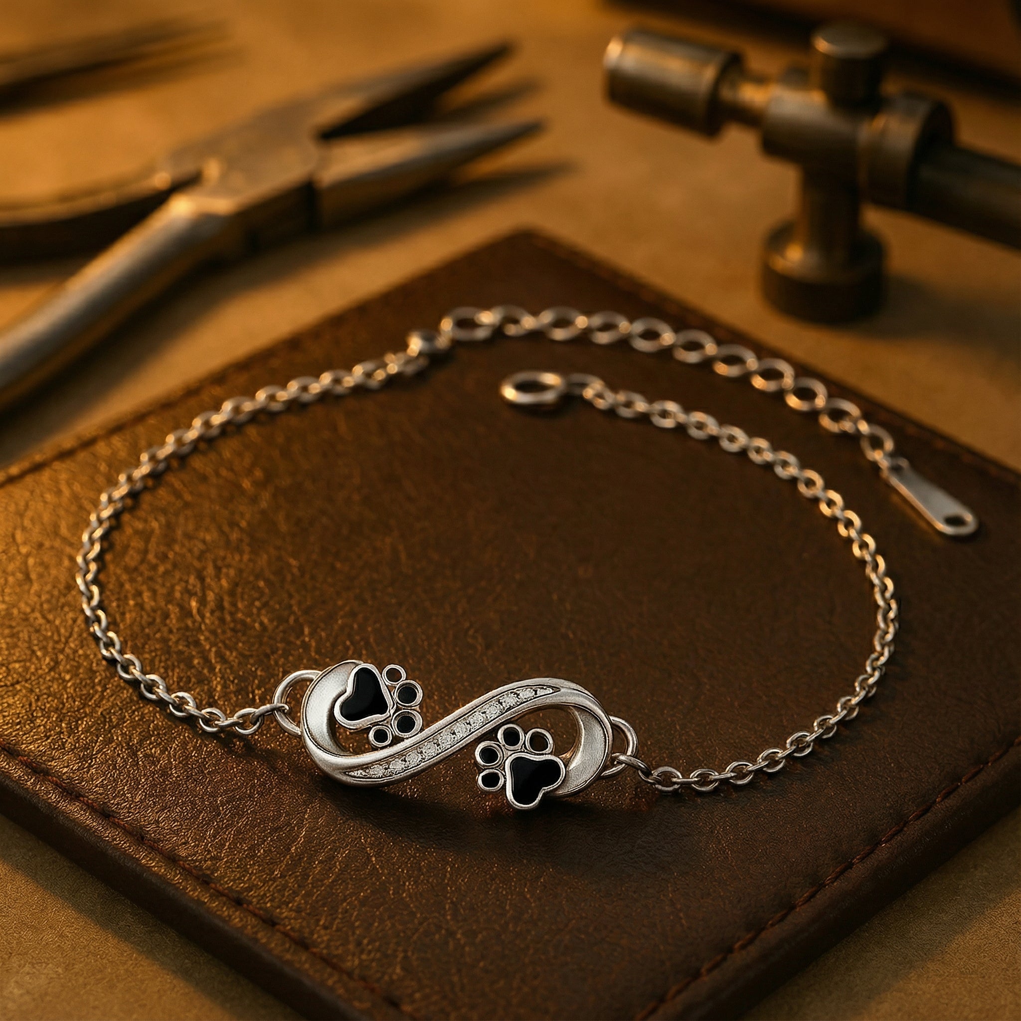 Rannekoru, jossa on äärettömyyssymboli ja tassukoru kuutiollisella zirkonialla.